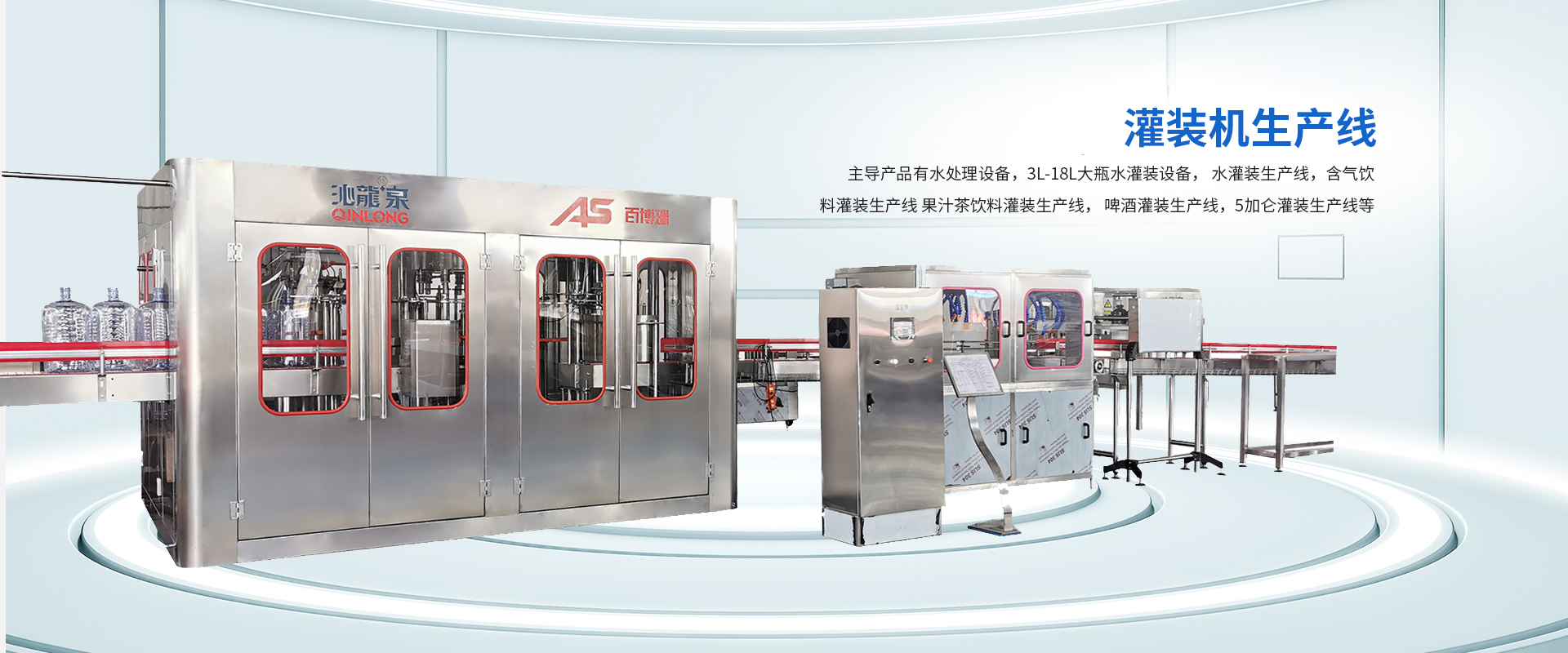 公司主導產品有水處理設備,3L-18L大瓶水灌裝機設備, 水灌裝生產線,含氣飲料灌裝生產線, 果汁茶飲料灌裝生產線, 啤酒灌裝生產線,5加侖灌裝生產線等。能夠配套整個生產線